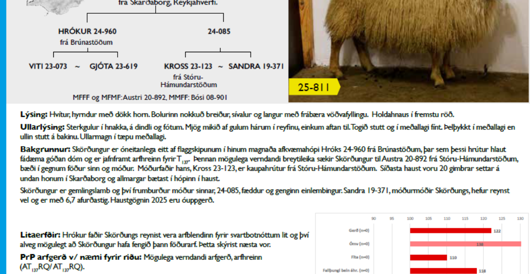 Nú er hrútaskráin 2025/26 aðgengileg á netinu (ýta) og ef bæði arfgerð og fjölbreytileikur erfðabakgrunnur eru skoðuð, tel ég sérstaklega ellefu hrútar áhugaverðir: Hrókur frá Brúnastöðum með T137/ARQ sem var líka í fyrra og kom framúrskarandi vel út, bls. 36: Jarl frá Lóni 2 í Kelduhverfi með T137/ARQ: Skörðungur frá Skarðaborg með T137/T137 (þ.e. arfhreinn!),…
